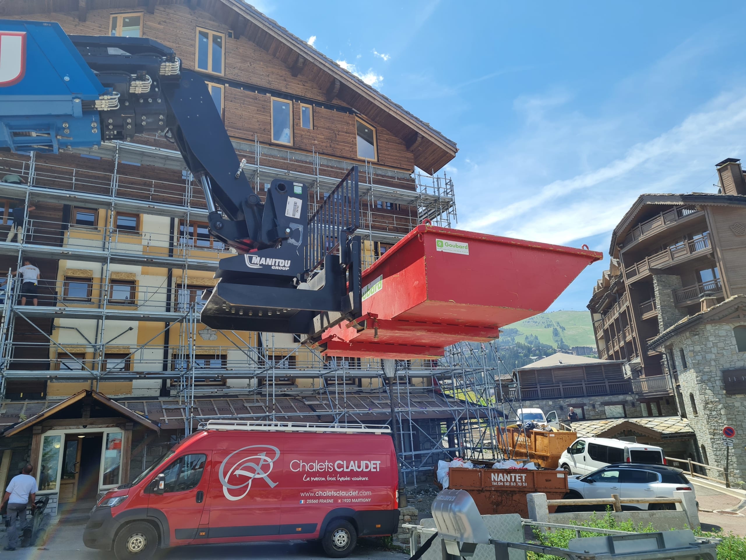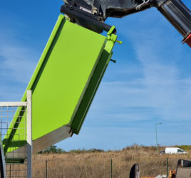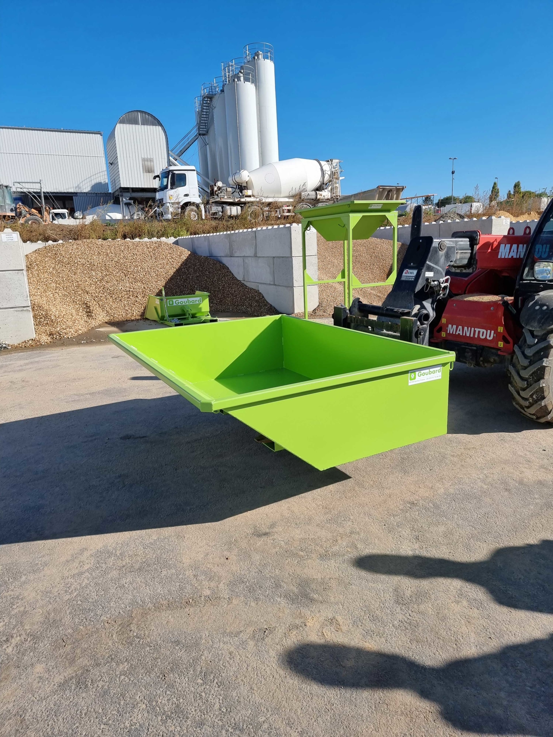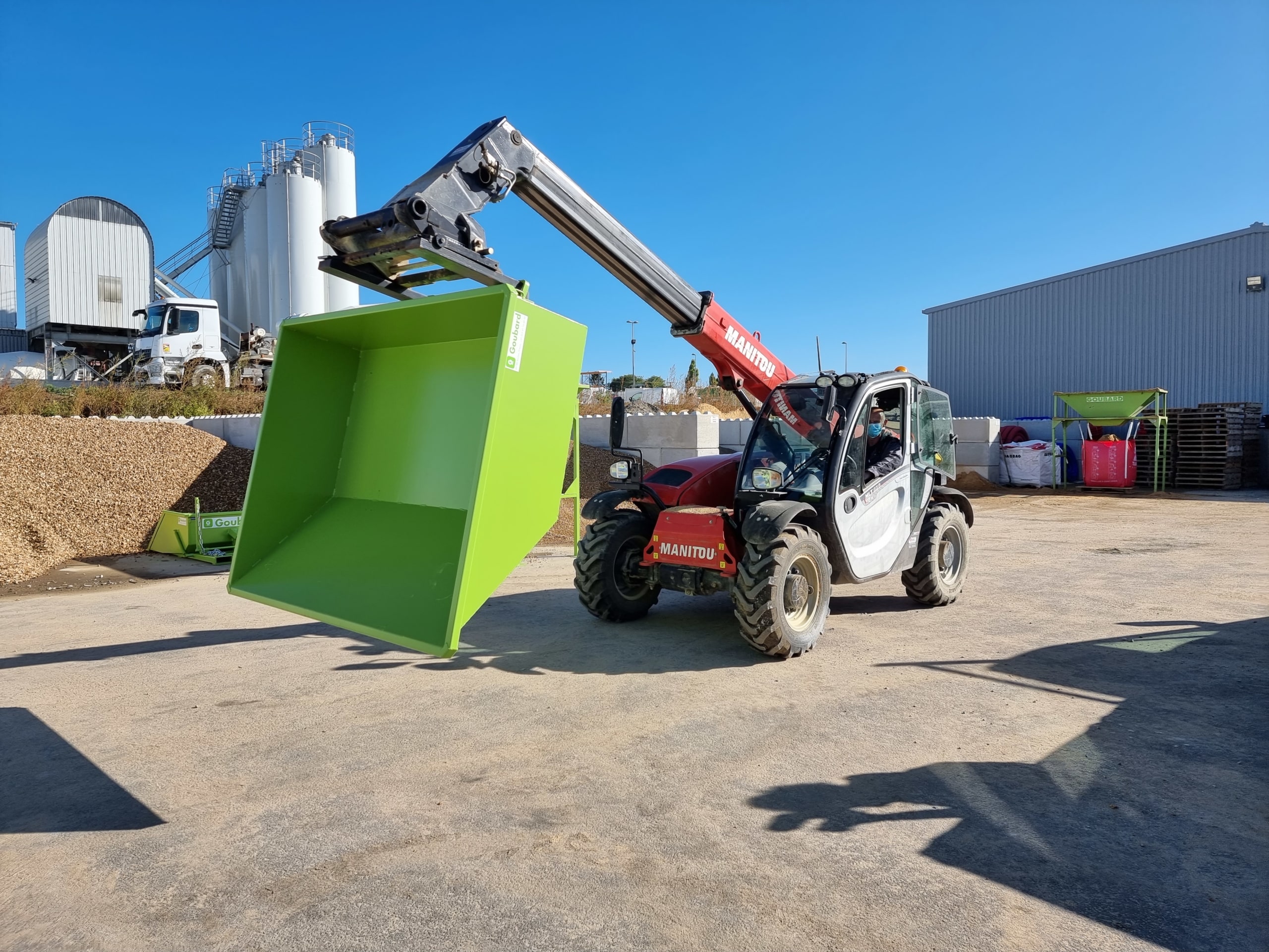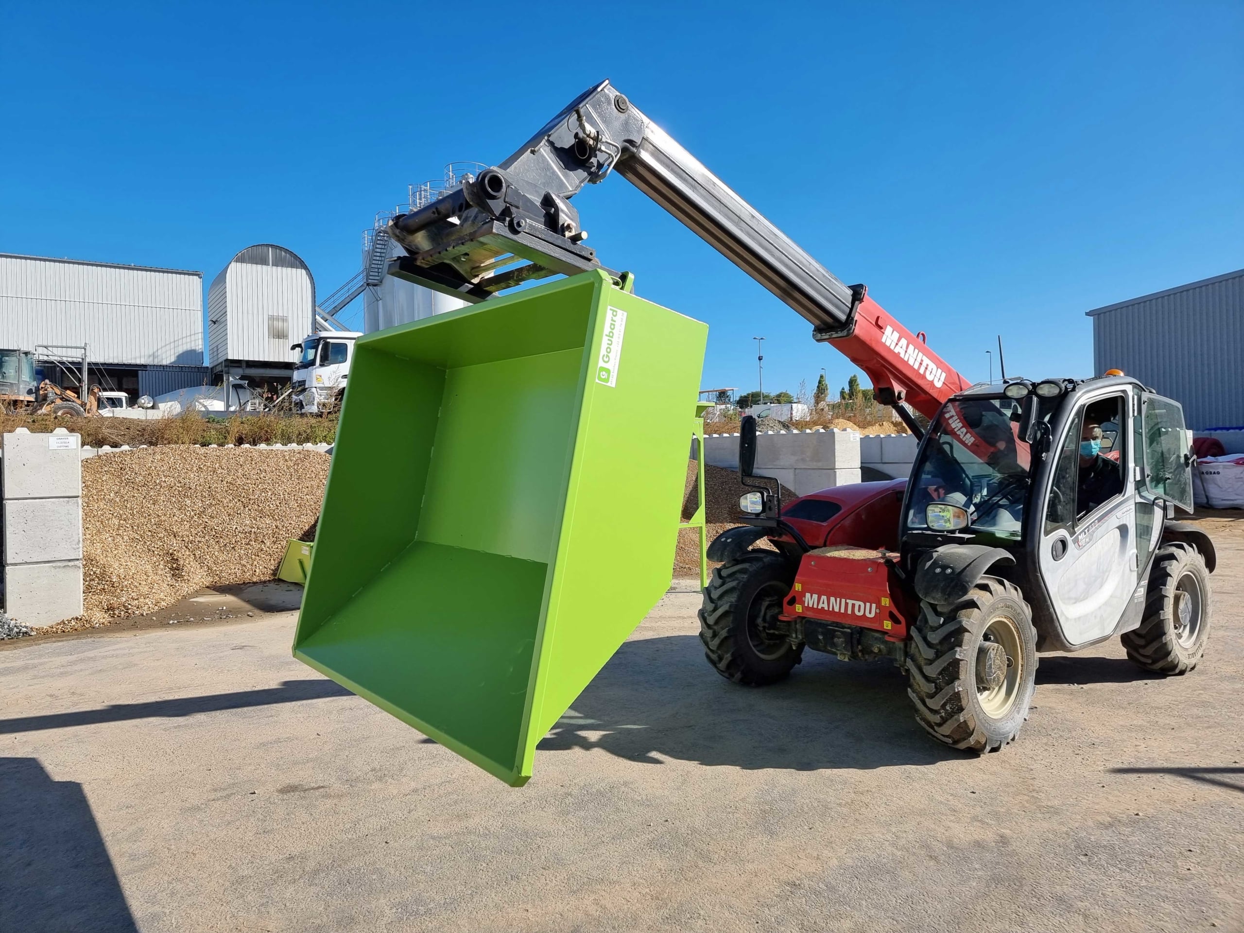 Vaciado únicamente por inclinación de las horquillas Altura reducida Bloqueo automático en los talones de las horquillas Adaptado a las aplicaciones bajas (escombros, mortero, orujo bajo la prensa, residuos bajo las máquinas…)